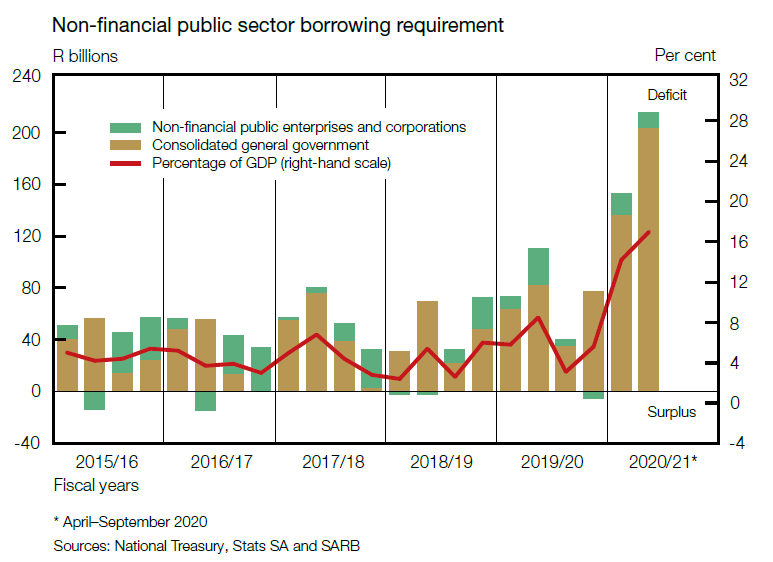 Below is an idea of the borrowing the South African Government + Public Corporations require for the next year. As you can see, the borrowing requirement has increased quite dramatically. The government now needs to borrow close to R200 billion for this year’s expenditures due to Covid lockdowns, fall in revenue collections and increased support required for the economy.