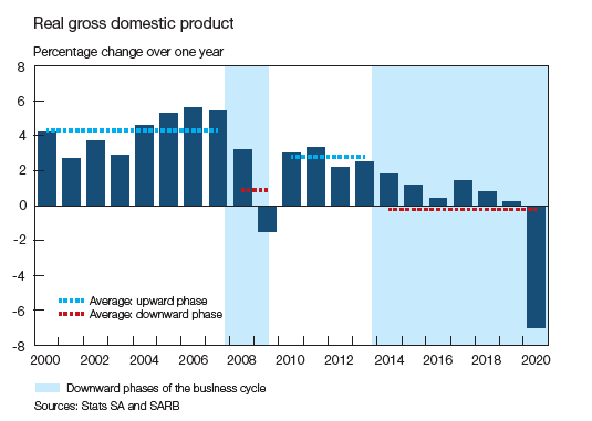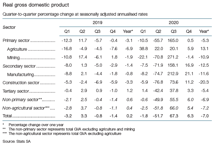 We begin by looking at what has happened over the past couple of months. With the closure of most economies around the world and the halt to most business activity locally, the economy took some massive knocks, with growth rates in certain sectors falling double digits. Looking at the economy as a whole, 2020 saw a big drop in GDP of 7%. The national lockdown-induced contraction in 2020 was the second-largest annual contraction since 1920, when real GDP fell by 11.9%, and was also about five times larger than the contraction of 1.5% that followed the global financial crisis in 2009. The decline in real GDP in 2020 consisted of a substantial contraction of 17.0% in the first half of the year and a recovery of 8.6% in the second half. The chart below shows how large this drop in GDP was relative to the previous year.