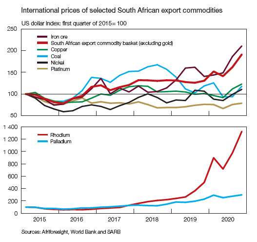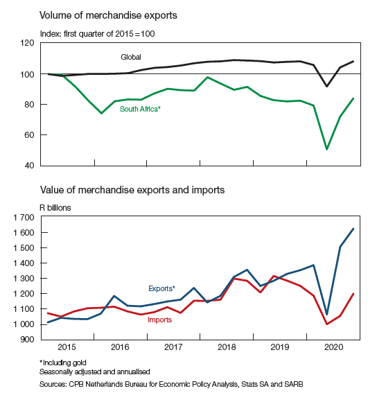 South Africa’s exports followed the further increase in global trade volumes in the fourth quarter of 2020, as trade continued to recover from the COVID-19-induced low in the second quarter. The value of South Africa’s net gold and merchandise exports surged further to an all-time high, while that of merchandise imports rose at a faster pace than in the previous quarter. The chart below describes this. In the first chart (top graph) we have the change in Export volumes of the world and South Africa. It is clear to see that although South Africa has lagged in terms of volume of exports, the recovery pattern is similar to the world’s expansion.