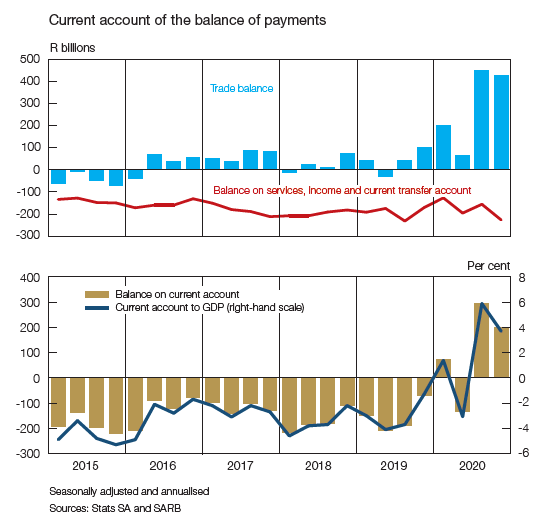South Africa’s trade surplus narrowed to R425 billion in the fourth quarter of 2020, from the record-high R451 billion in the third quarter. The higher value of imports primarily reflected a sharp increase in volumes, while the increase in the value of exports emanated from both volumes and prices. The smaller trade surplus, alongside a sizeable widening of the shortfall on the services, income and current transfer account, narrowed the surplus on the current account of the balance of payments from R294 billion in the third quarter of 2020 to R198 billion in the fourth quarter, or from 5.9% to 3.7% of GDP.
