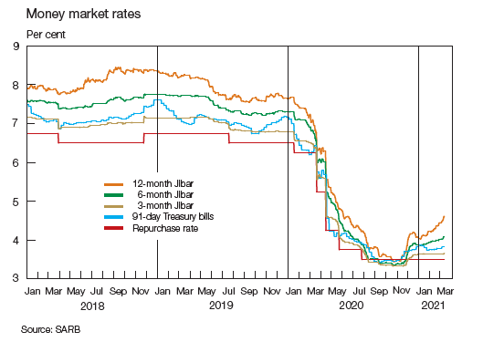 South African interest rates have been falling for much of the past year, seeing the current repo rate near historic lows. The repurchase (repo) rate was kept unchanged at a historically low 3.50% in January and March 2021. The SARB’s Monetary Policy Committee (MPC) cited a number of key challenges facing the domestic economy, including the continued negative impact of COVID-19, while the overall risks to the inflation and domestic growth outlook were viewed to be balanced.