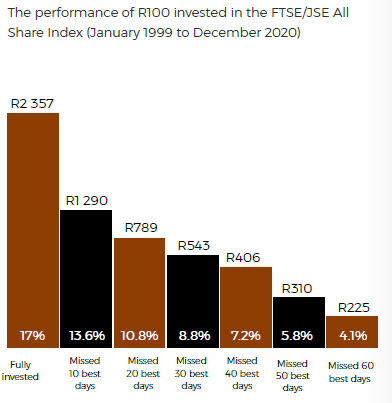 On the other side of the spectrum, sitting on the sidelines and missing those good days can be detrimental to your savings. Shying away from risk is detrimental to any long term investment goals as most riskless assets only produce a return at or below inflation. So complete risk aversion is not the ideal scenario to be in as well. Below is a demonstration of this. By missing out on the 10 best days of the JSE during a period of 20 years, you would be almost 50% behind on your potential return had you not taken the money out.